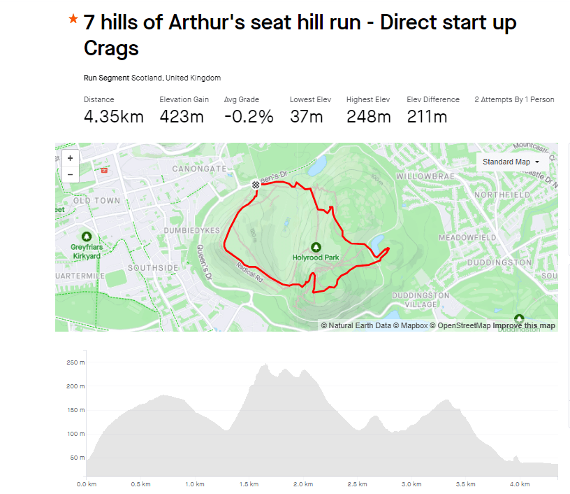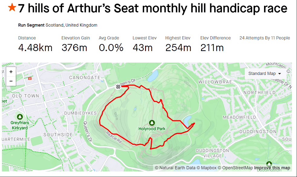 As the route now has 2 alternative starts – plus some route choice between the summits – I’ve created two new Strava segment for the full “7 Hills of Arthurs Seat Monthly Handicap race” – using the alternative slightly longer start and shorter direct start: