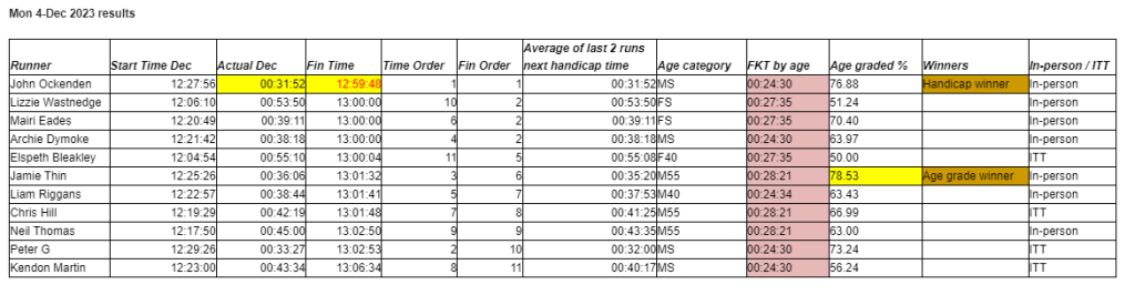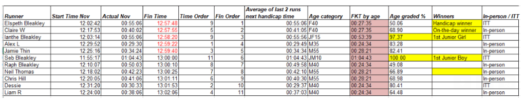 7 on the day – with Claire Ward winning the in-person handicap on the day, but being pipped by 7 secs by Elspeth who ran an ITT on another day during the week