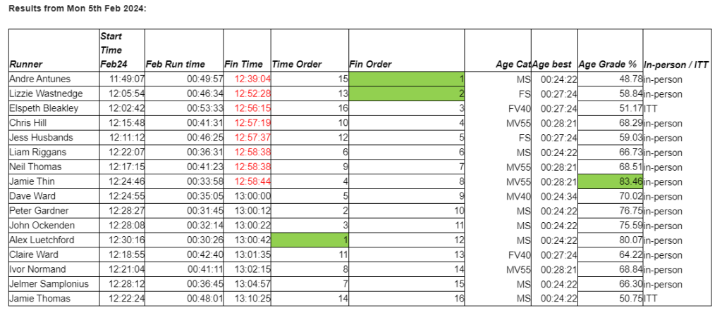 | Runner | Start Time Feb 25 | Feb 25 Run time | Fin Time | Time Order | Fin Order | Age Cat | Age best | Age Grade % | In-person / ITT |