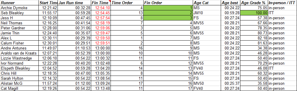 | Runner | Start Time Jan 25 | Jan25 Run time | Fin Time | Time Order | Fin Order | Age Cat | Age best | Age Grade % | In-person / ITT |